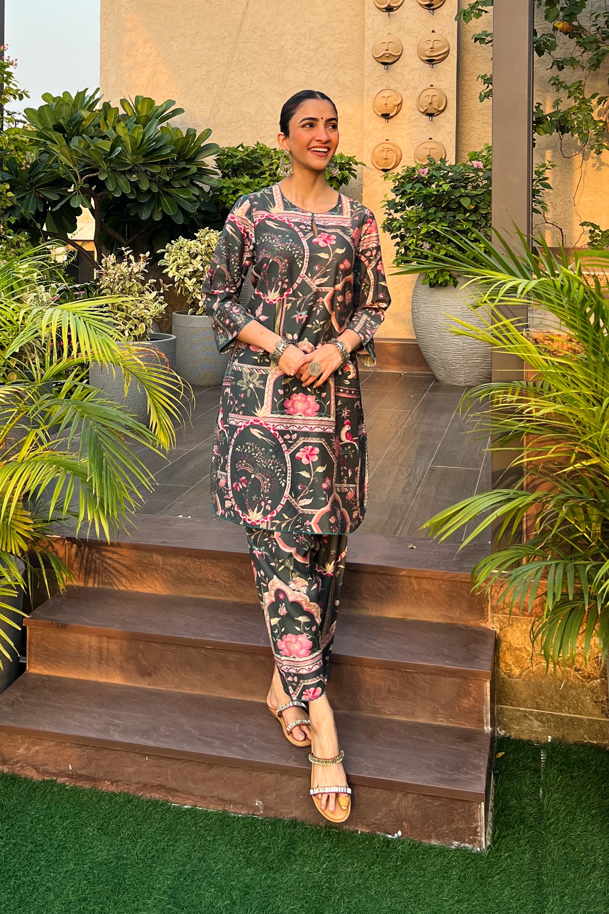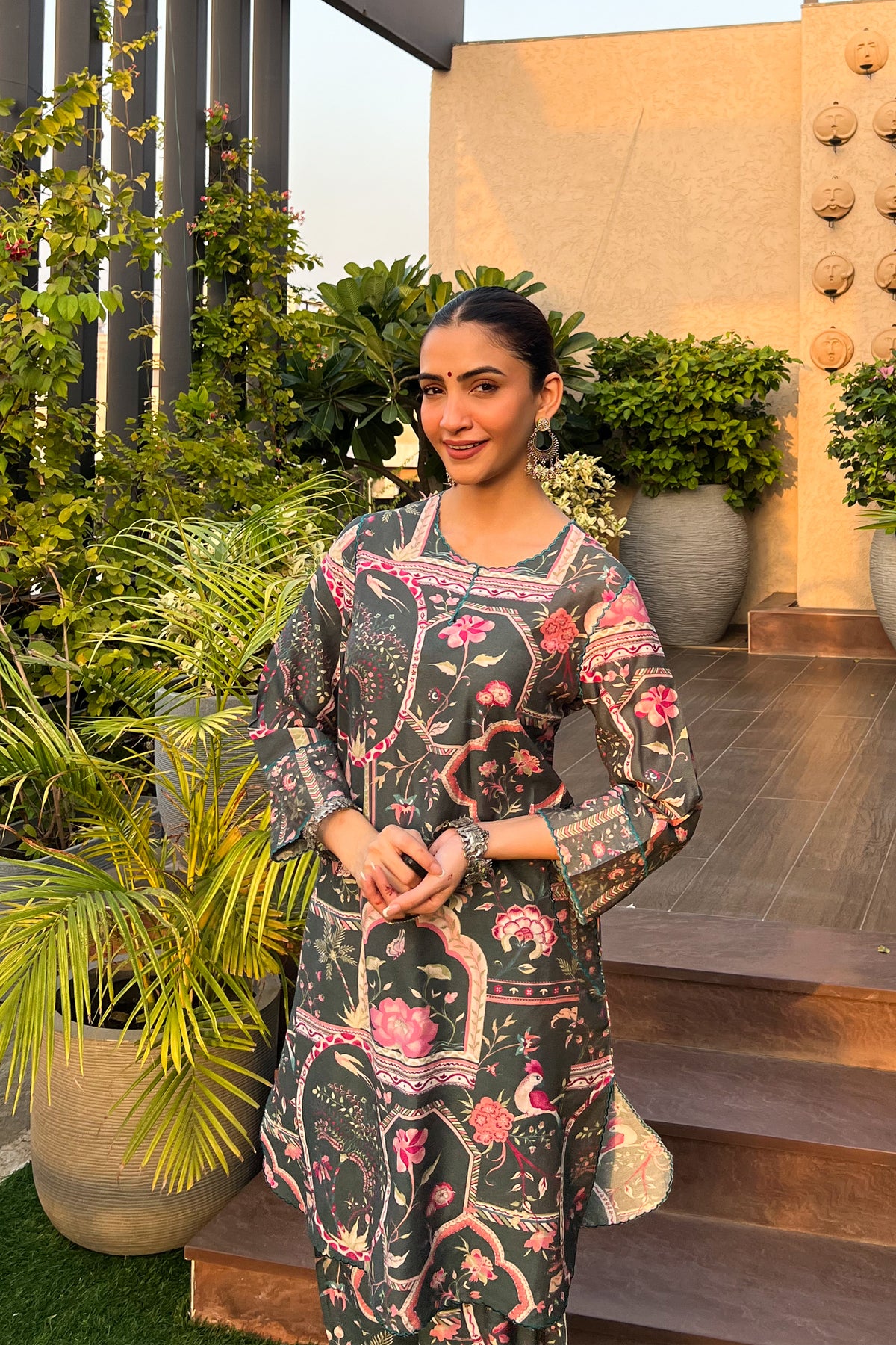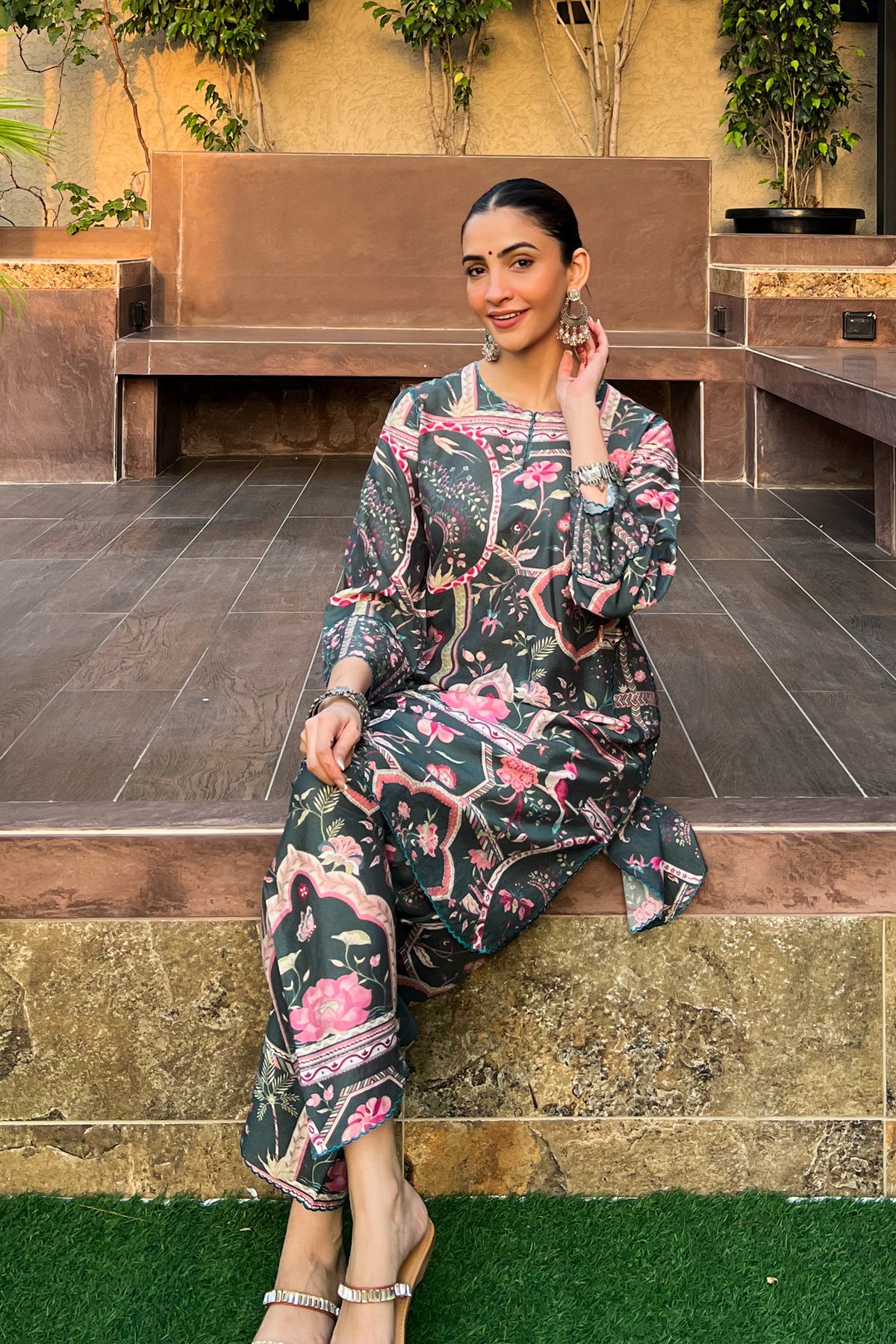 Kurta and slim salwar in a signature sage print on chanderi silk, with resham embroidery detailing for an easy to wear festive co-ord.