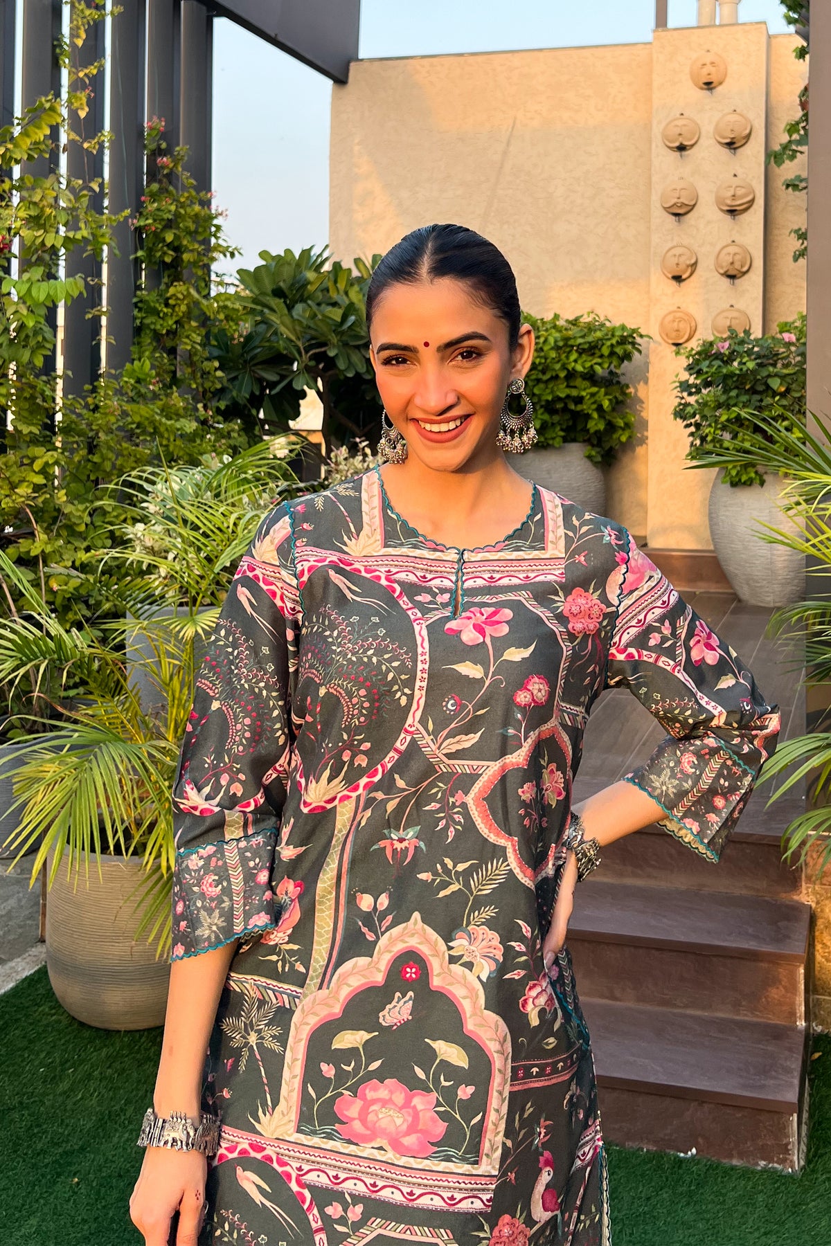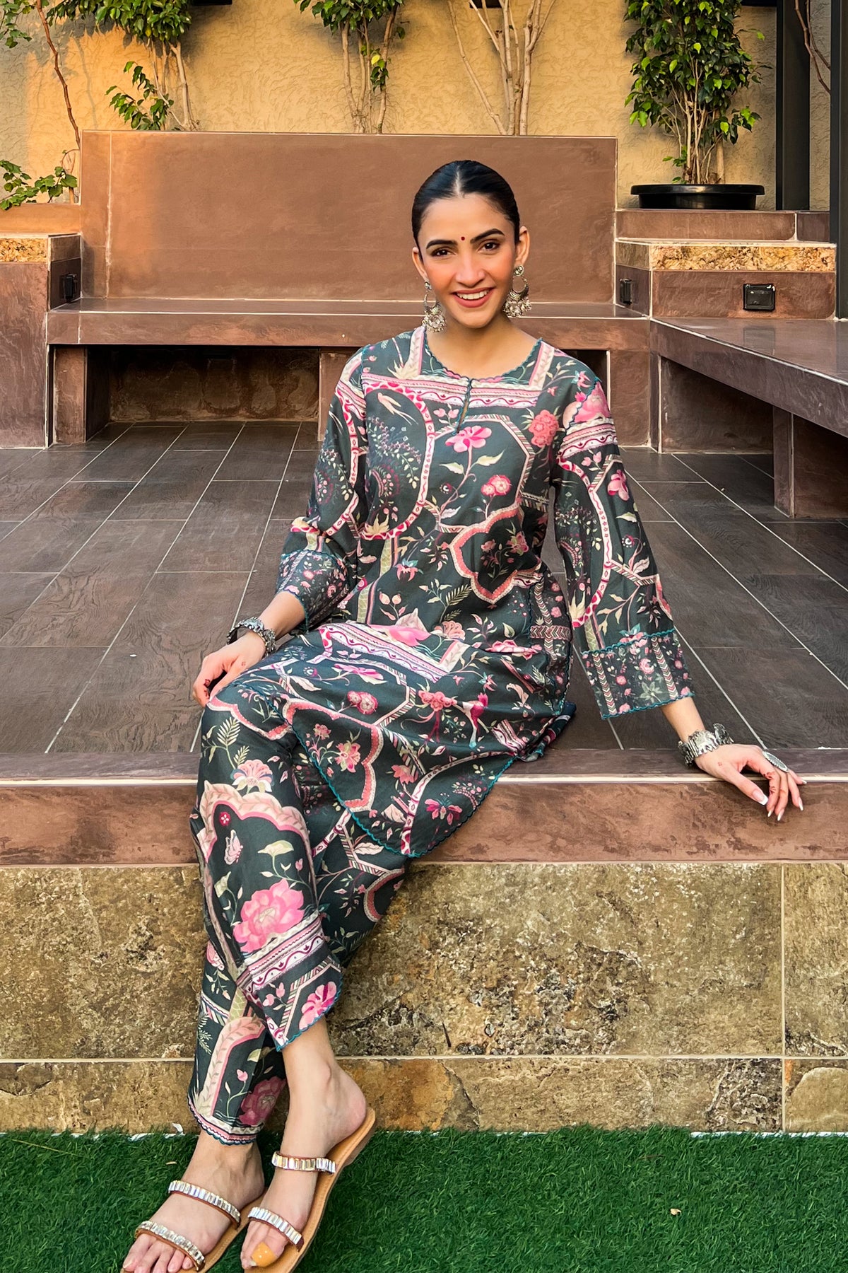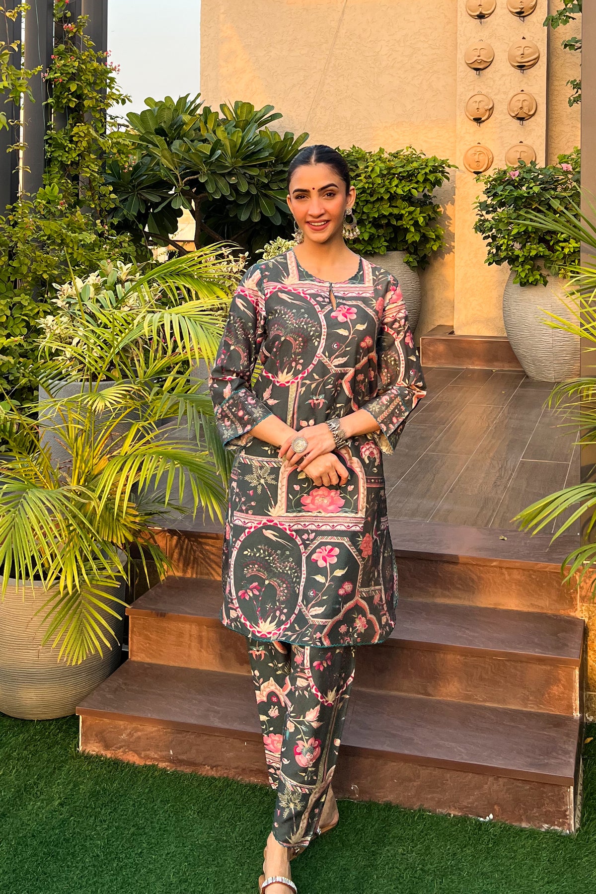 Kurta and slim salwar in a signature sage print on chanderi silk, with resham embroidery detailing for an easy to wear festive co-ord.