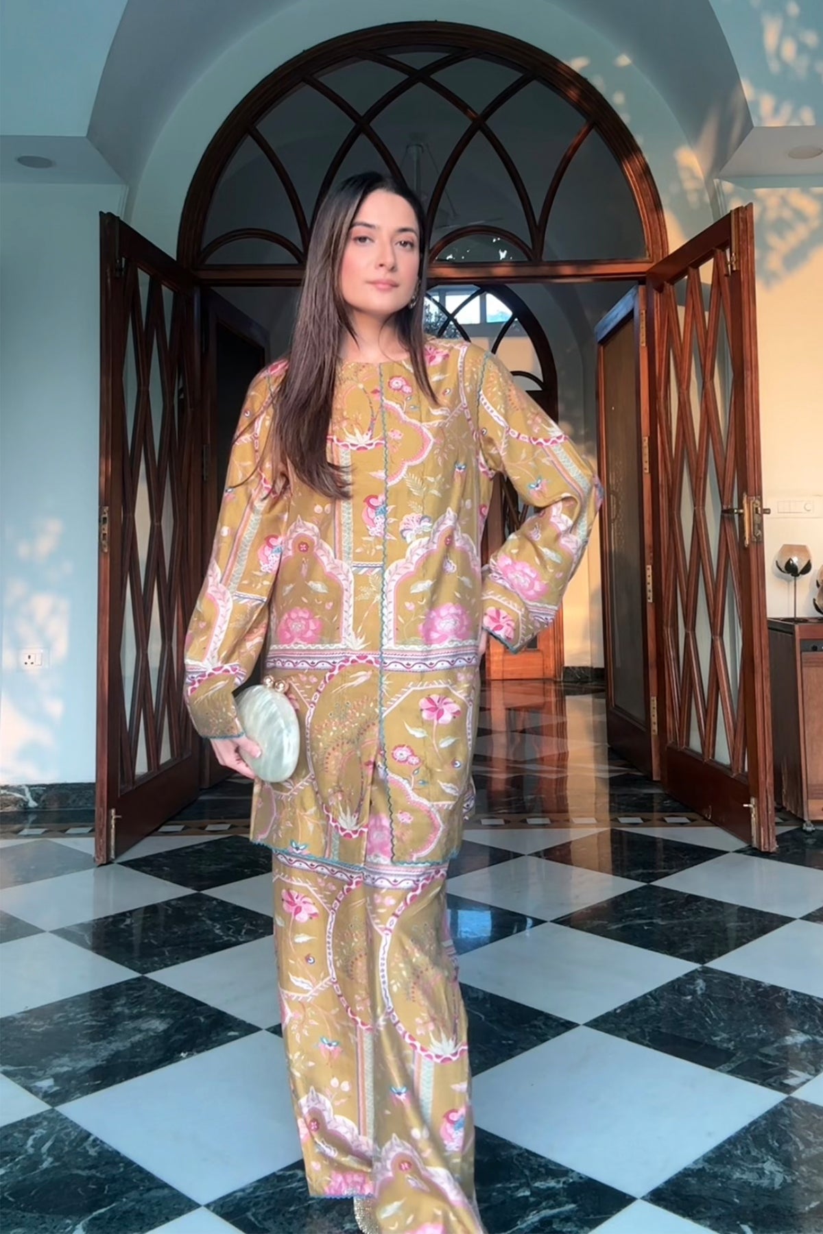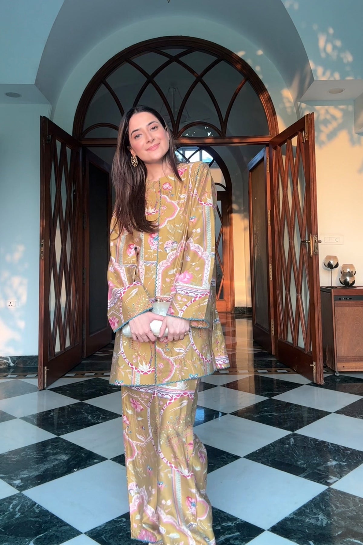 Tunic and palazzos in a signature sage print on chanderi silk, with resham embroidery detailing for an easy to wear festive co-ord.