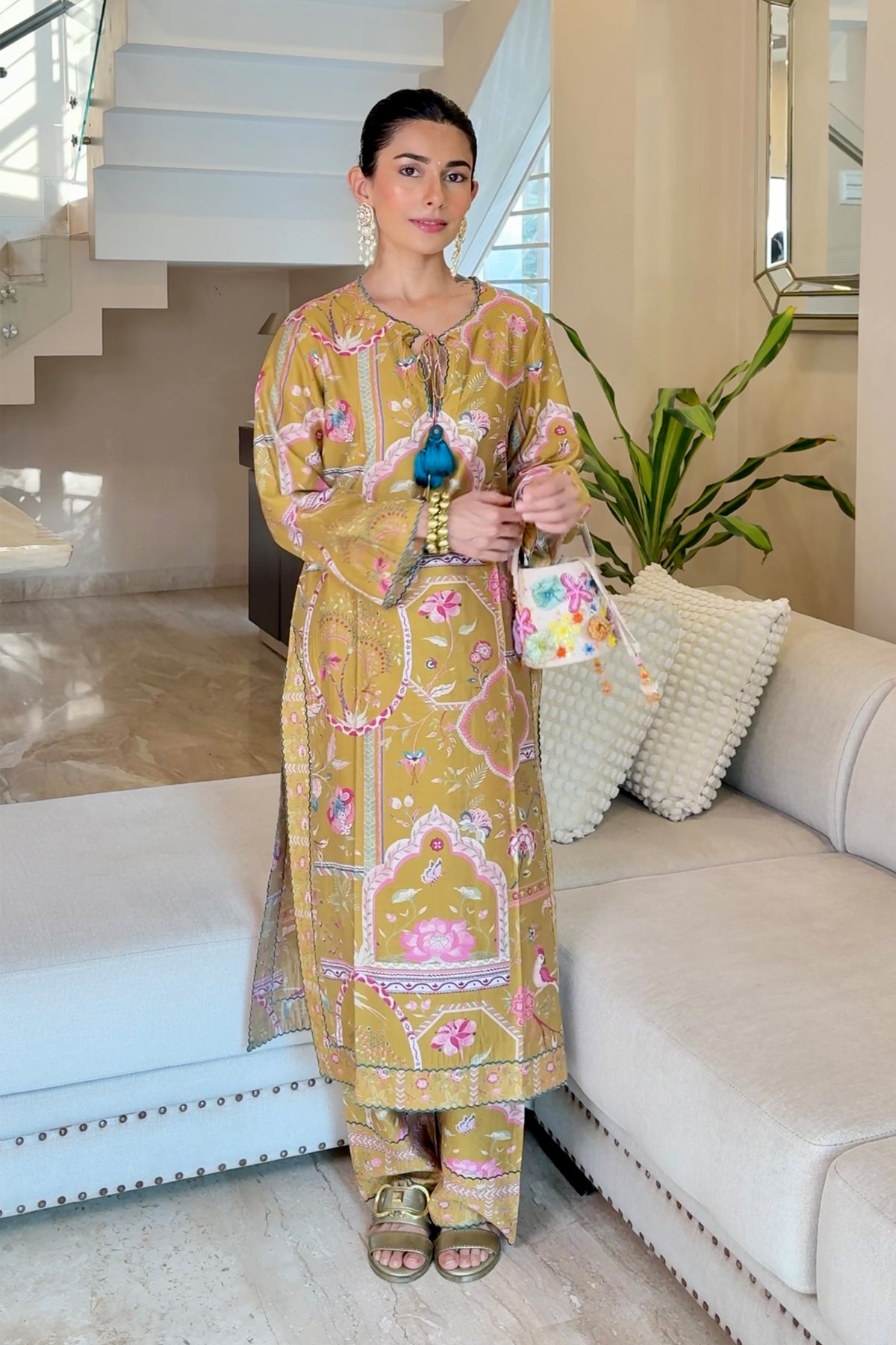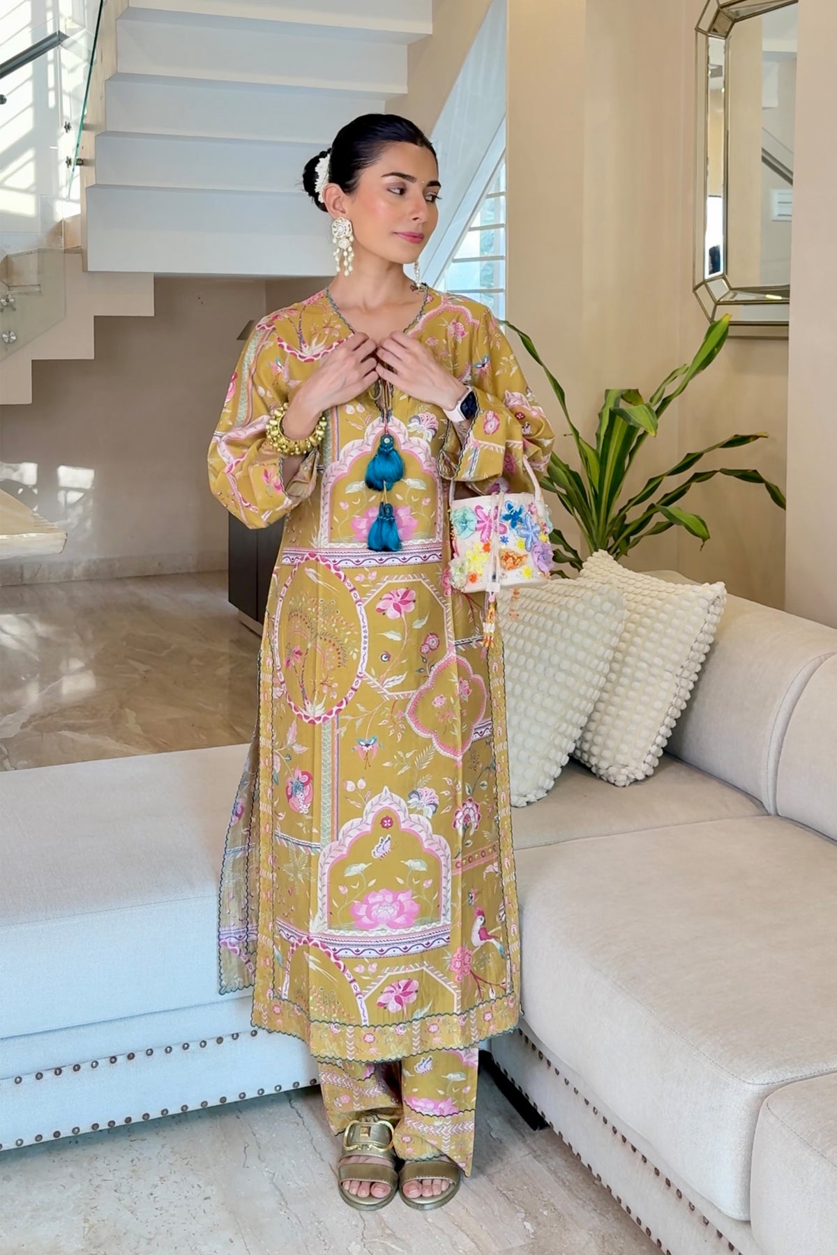 Kurta and pants in a signature sage print on chanderi silk, with resham embroidery detailing for an easy to wear festive co-ord.